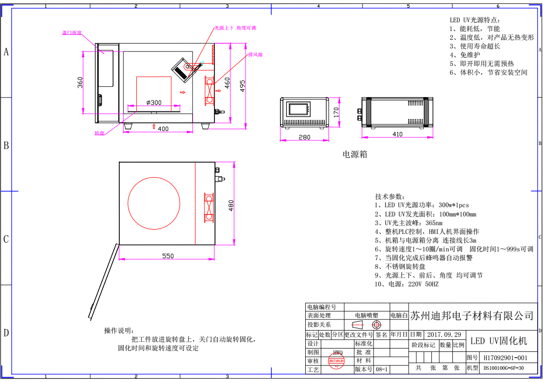 本UVLED固化炉照射系统采用微波炉式外形设计,轻便简洁。主要运用于UV胶水本固化、UV老化实验及同一治具多个产品的UV固化,光照强度可调,旋转速度可调,固化时间可调,可选择365nm、385nm、395nm、405nm等不同波长,光斑可根据实际固化面积选择;不同功率的LED对应固化涂覆在不同材质上的UV胶水、UV油墨、UV光油、UV油漆等。UVLED固化炉无需预热可即开即亮,高纯度照射,没有热辐射和深度紫外光,使用寿命长。